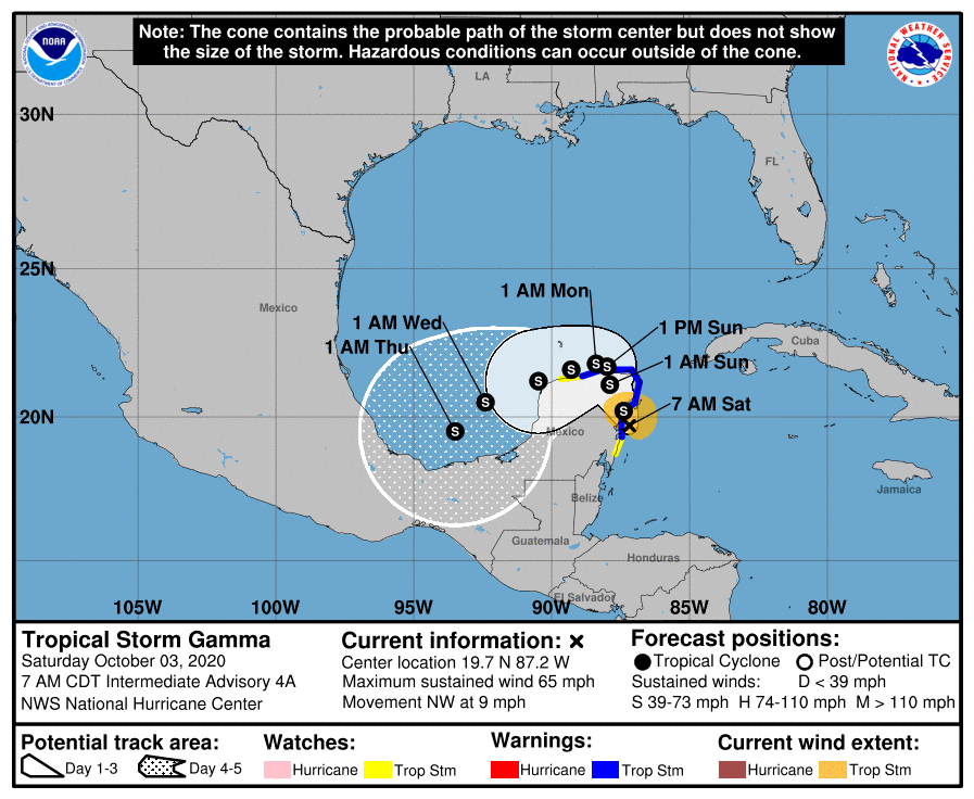 Tropical Storm Gamma is forecast to make a Yucatan landfall in about 12 hours, then move over the Gulf of Mexico and track along the Yucatan Peninsula.