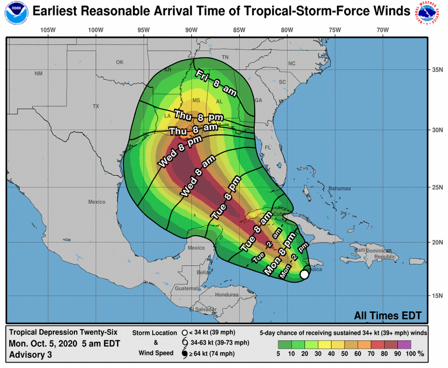 HOLT, Fla., Oct. 5, 2020—Tropical Depression 26 has now become Tropical Storm Delta.