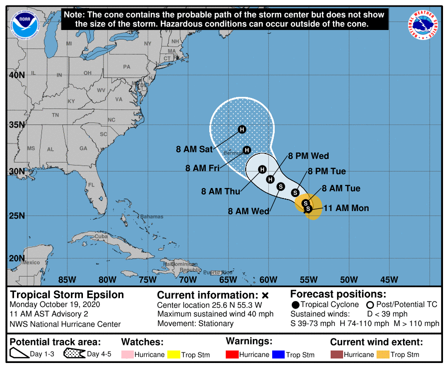 Tropical Storm Epsilon is not expected to have an impact on Florida or the United States.