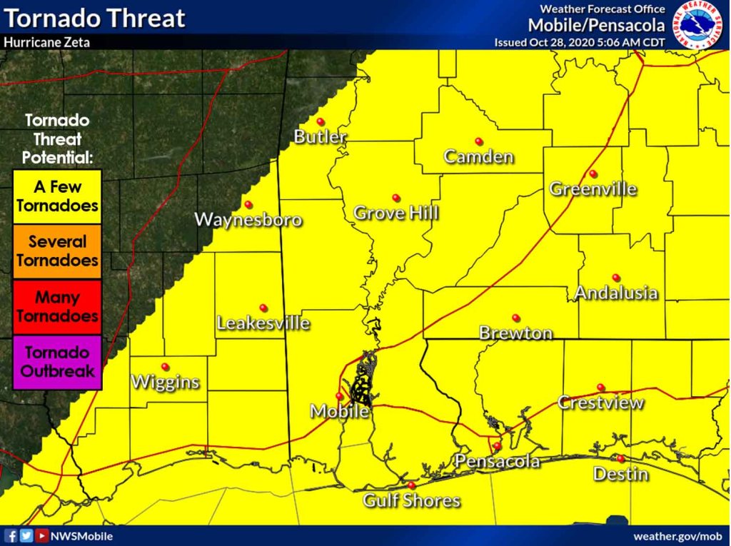 HOLT, Fla., Oct. 28, 2020—The National Weather Service in Mobile is forecasting an increase in the possibility of tornado activity this morning as Hurricane Zeta continues its path toward the Gulf coast.