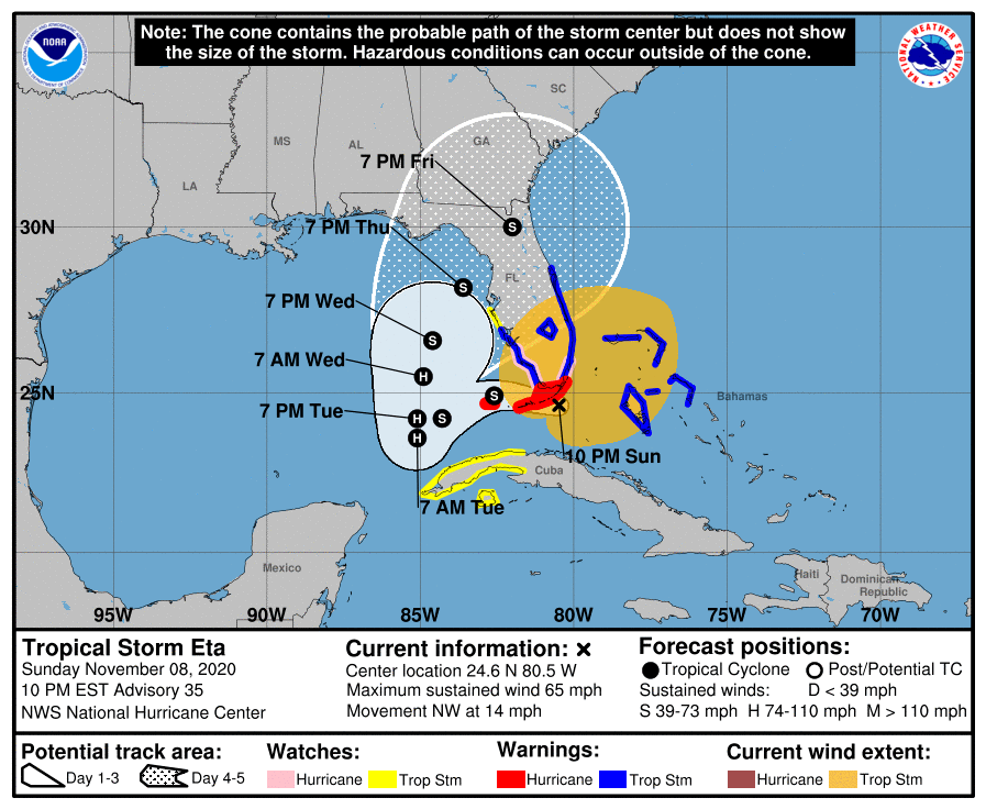 The center of Eta will pass near or over the Florida Keys tonight and early Monday, and be over the southeastern Gulf of Mexico late tomorrow and Tuesday, according to the National Hurricane Center.