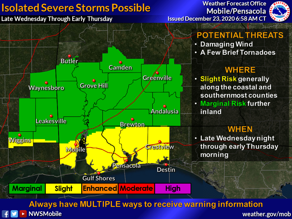 HOLT, Fla., Dec. 23, 3030—The National Weather Service in Mobile is calling for a risk of severe storms in the entire forecast area tonight into tomorrow morning.