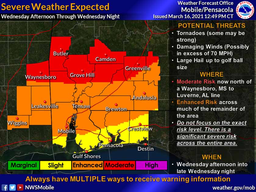 HOLT, Fla., March 16, 2021—All signs are pointing to a volatile severe weather setup for tomorrow according to the National Weather Service in Mobile.