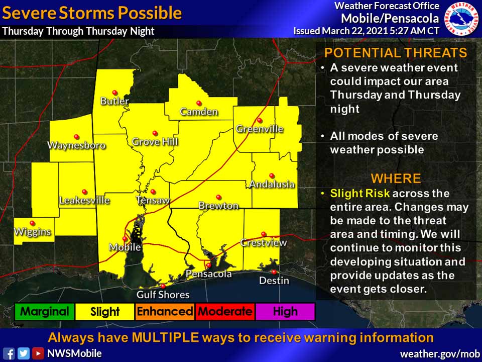HOLT, Fla., March 22, 2021—Another round of severe weather is in the forecast for Thursday according to the National Weather Service.