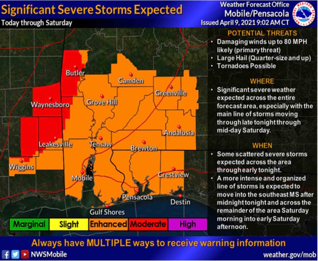 HOLT, Fla., April 9, 2021—The severe weather risk for this area has been elevated to a level 3 by the National Weather Center.
