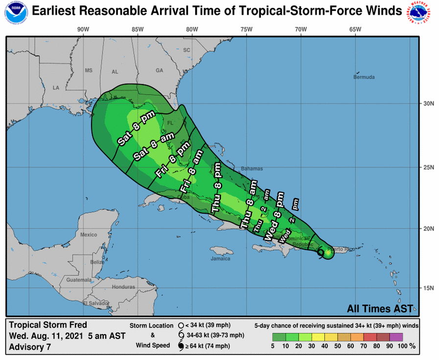 On the forecast track, the center of Fred is expected to be near or over Hispaniola later today, move near the Turks and Caicos Islands and the southeastern Bahamas tomorrow and move north of the northern coast of central Cuba Friday.