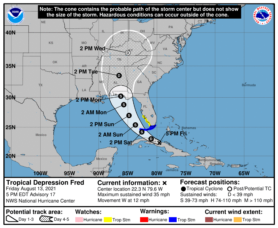 Fred remains a disorganized tropical depression, according to the NHC.