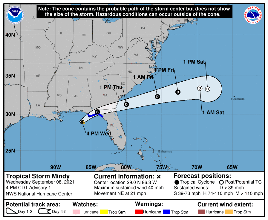 Mindy formed in the Gulf of Mexico as winds associated with a low pressure system strengthened in a couple of hours between the National Hurricane Center’s 2 p.m. tropical update and its 4 p.m. advisory on the newly formed tropical storm.