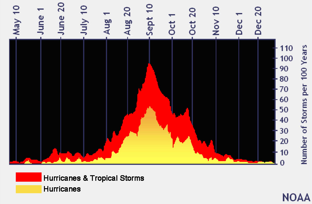 With a six-month hurricane season that begins June 1, the end of August is the mid-point; however, Sept. 10 is considered the climatological peak of the Atlantic Basin, which includes the Atlantic Ocean, the Caribbean Sea and the Gulf of Mexico.