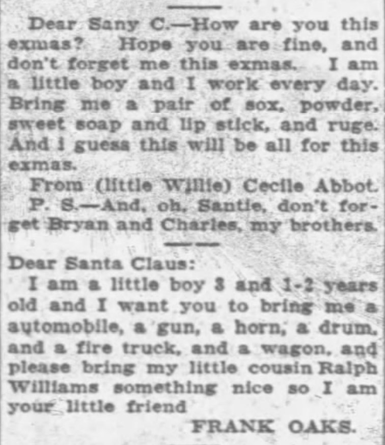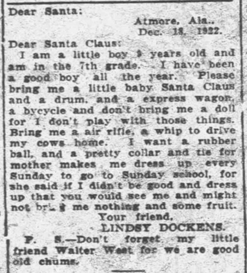 Here’s a sample of “Dear Santa” letters from 1922 and 1923, all from the Pensacola Journal.