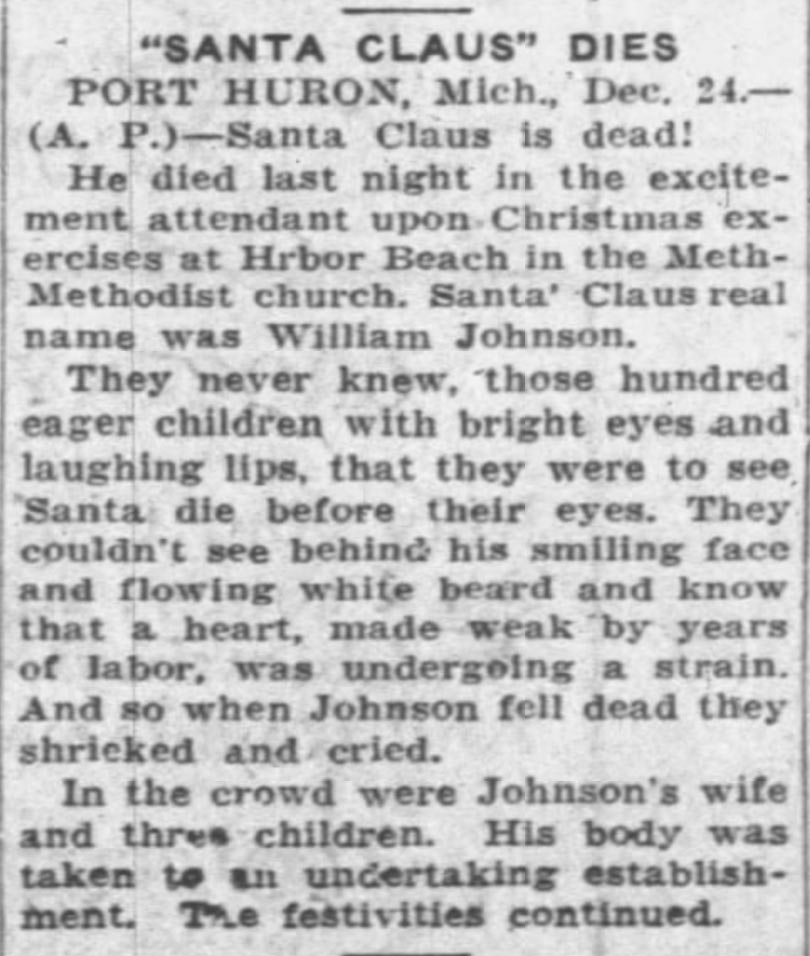 Not to end in a downer, but here’s a sad, kinda quirky 1925 Santa news story from the Pensacola Journal with a dateline from Michigan that catches the eye.