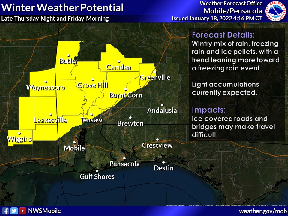 According to the National Weather Service in Mobile, a wintry mix of rain, freezing rain and ice pellets is possible, although it is trending more toward a freezing rain event.