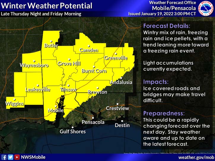 The National Weather Service in Mobile has adjusted the Level 2 winter weather forecast area to the southeast of Interstate 65 along a Fairhope-Brewton-Andalusia line.