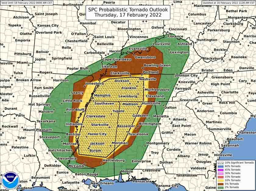 This is a large storm system with the main threat northwest of the I-65 corridor, including most of Mississippi and Tennessee and the northwest portion of Alabama.