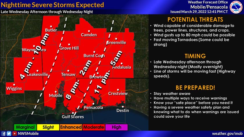 HOLT, Fla., March 29, 2022— A significant severe weather outbreak is expected across the local area late tomorrow afternoon through tomorrow night.