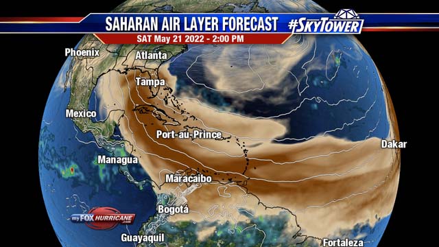 The Saharan Air Layer, aka a huge dust cloud, will make its way across the Atlantic Ocean to the Gulf Coast this weekend. When that happens, we can expect haze and amazing sunrises and sunsets. It can also affect allergies. The presence of the SAL can inhibit hurricane development. Reminder: Hurricane season begins in 11 days. (image courtesy FoxNews)