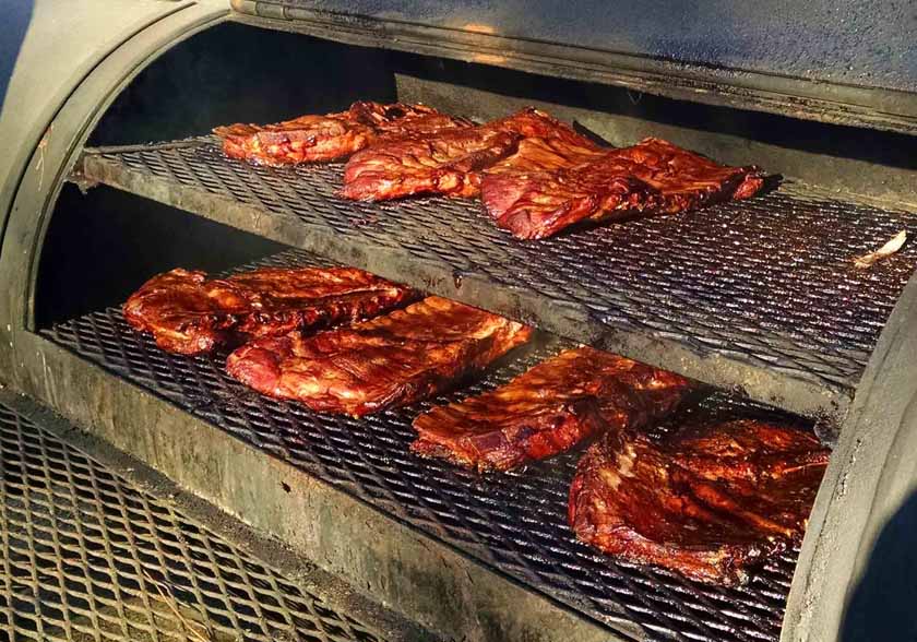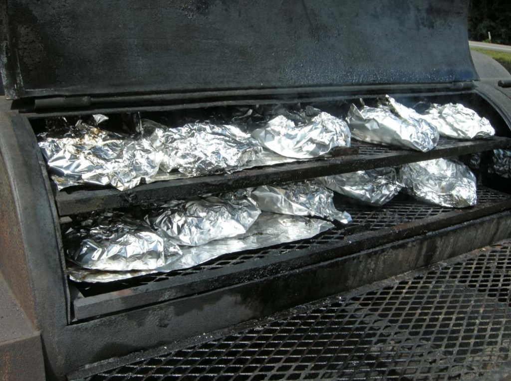 Three smokings are scheduled for this weekend: two on Friday and one on Saturday for a total of 198 racks. The ribs weigh about 4 1/2 pounds before they go in the smoker. After four hours, they’re fall-off-the-bone tender and juicy.