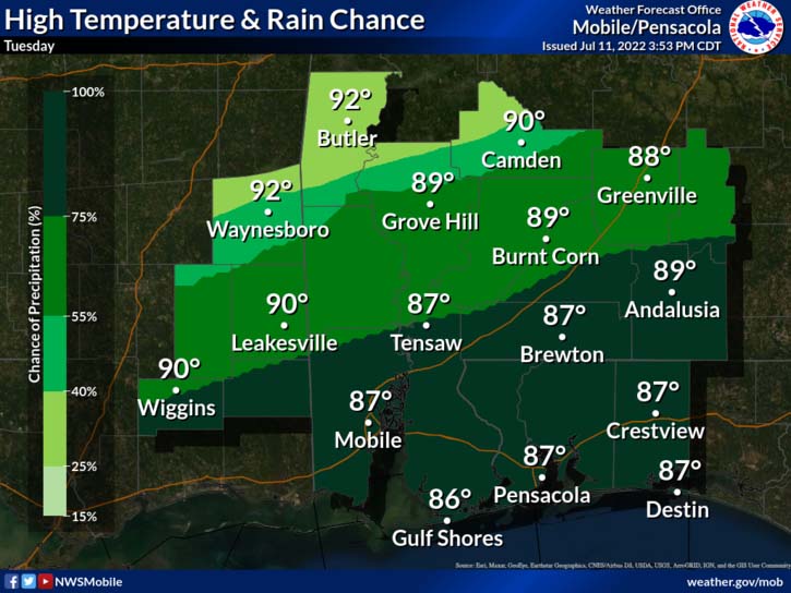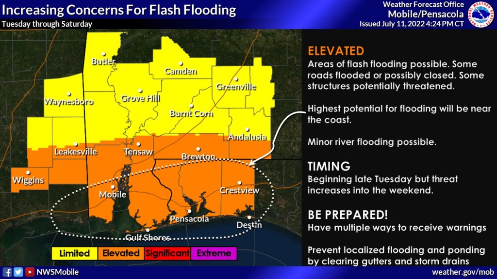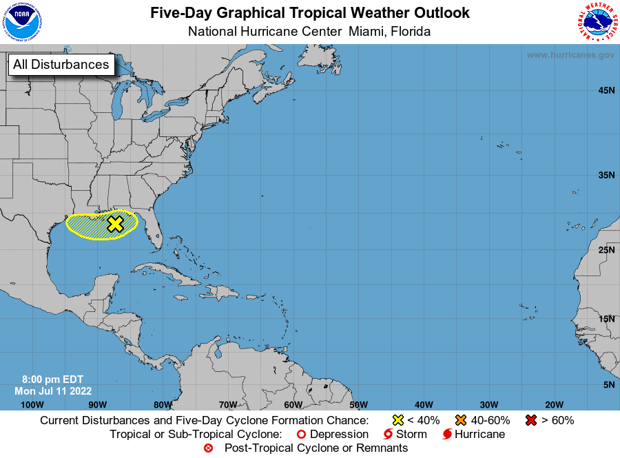 HOLT, Fla., July 11, 2022—Heavy rains are possible for the next several days from the Florida panhandle to Louisiana due to a low pressure system hovering over the northern Gulf of Mexico.
