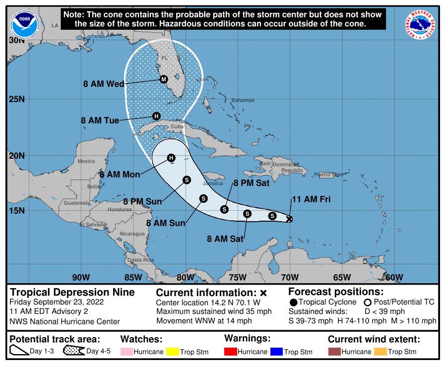 HOLT, Fla., Sept. 23, 2022— The National Hurricane Center upgraded Invest 98 to Tropical Depression Nine this morning and is forecasting it to develop into a major hurricane before it reaches Florida’s west coast next week.