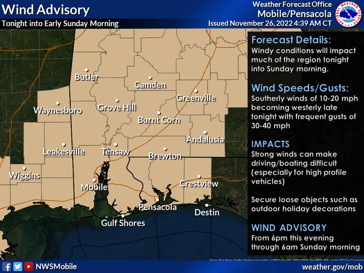 HOLT, Fla., Nov. 26, 2022—Northwest Florida is included in a low-end severe weather risk zone beginning tonight through tomorrow morning.