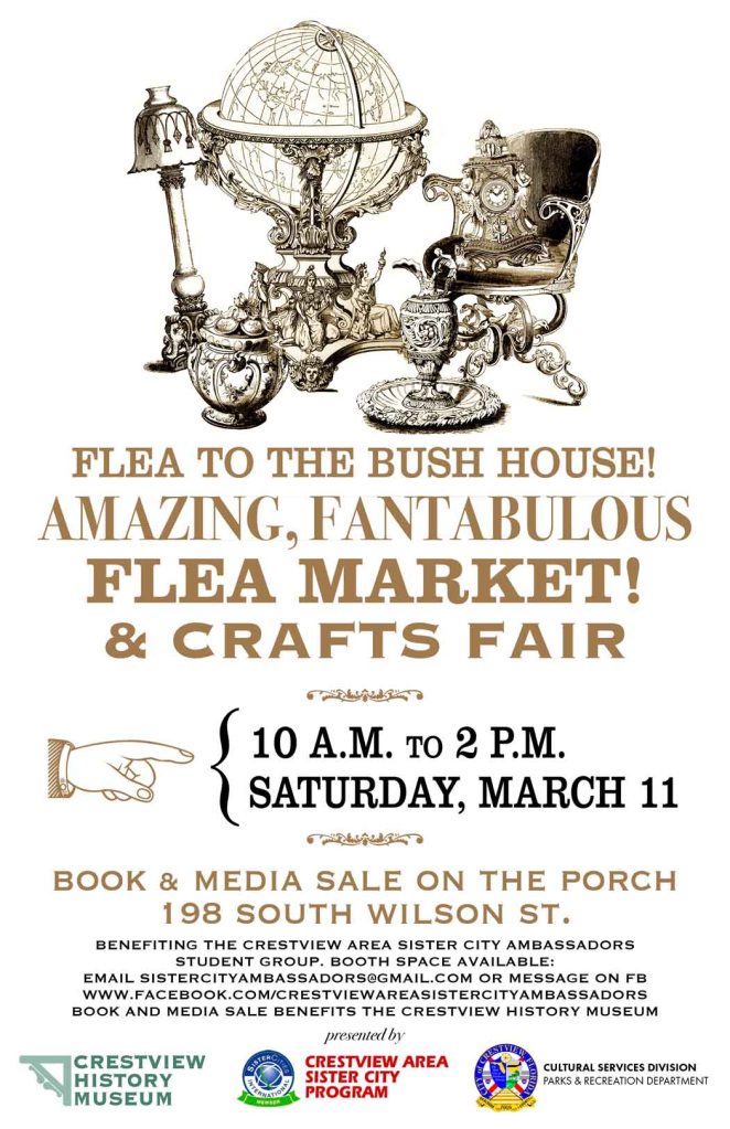 CRESTVIEW, Fla., Feb. 27, 2023—A flea market, crafts fair and book sale are scheduled at the Crestview History Museum at the historic Bush House March 11.