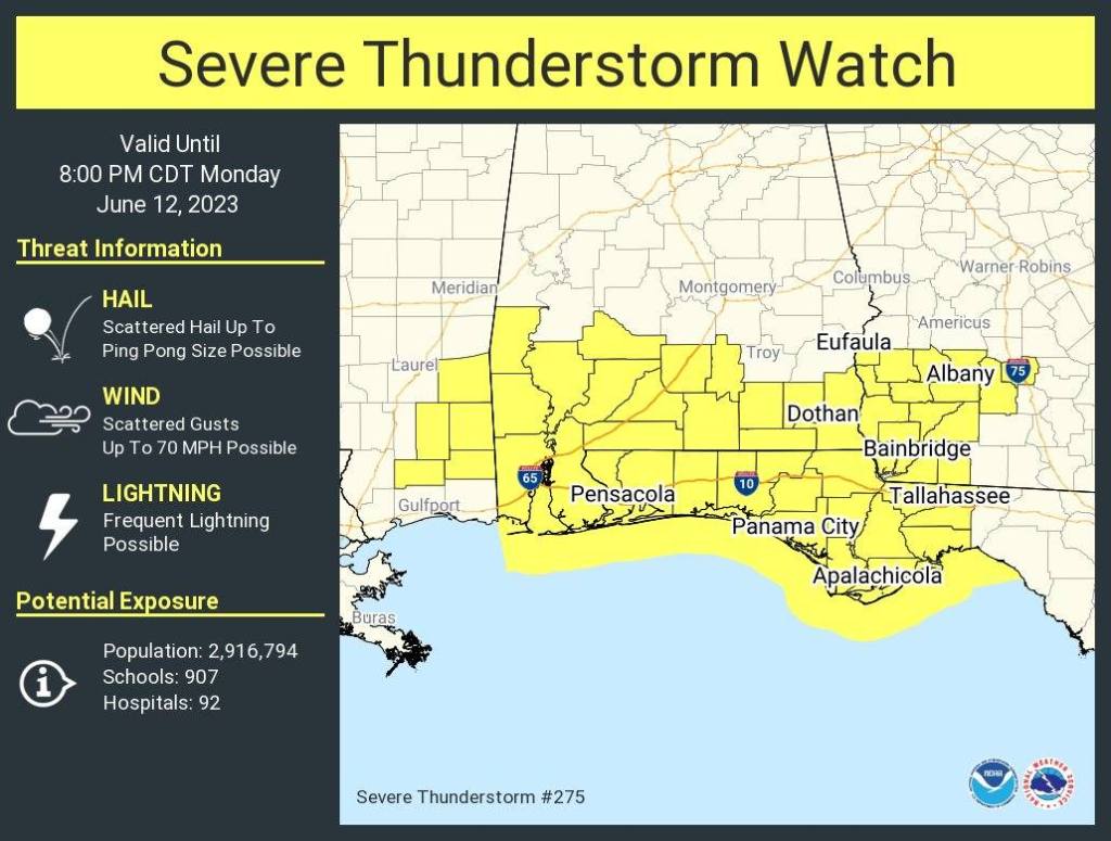 HOLT, Fla., June 12, 2022—The entire Florida panhandle and parts of lower Alabama are under a severe thunderstorm watch until 8 p.m.