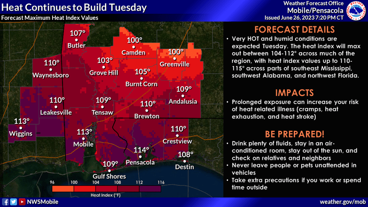 Areas to the west in coastal Santa Rosa and southern Escambia counties are under an excessive heat warning where the heat index can reach up to 115 degrees.