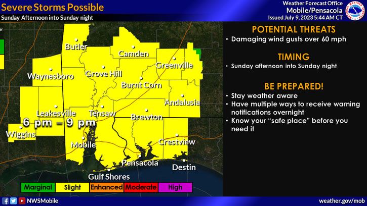 HOLT, Fla., July 9, 2023—Today will be an active day for showers and thunderstorms within the entire Mobile National Weather Service area.