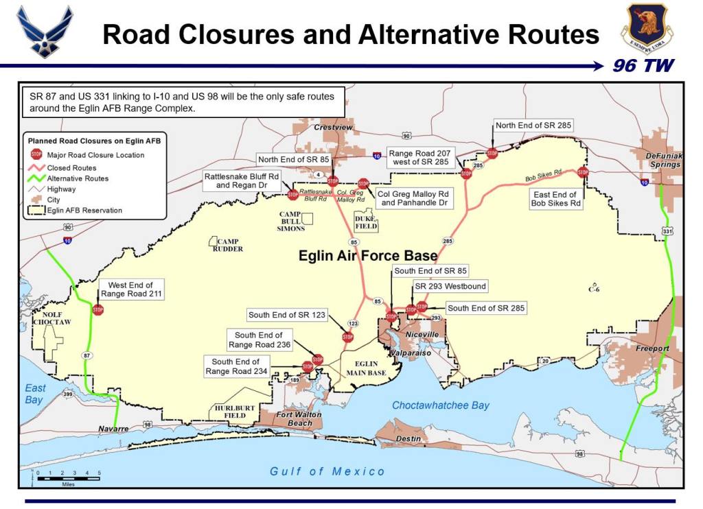 For more information and updates on road closures, visit http://www.eglin.af.mil or call the Eglin Public Affairs Office at 850-882-3931.