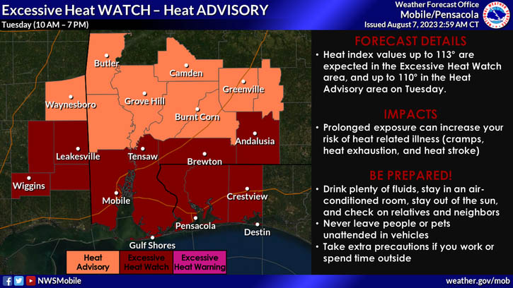In addition, northwest Florida will be under a level 1 risk for severe weather tomorrow. Chance of afternoon thunderstorms is 60 percent, which could break the excessive heat, depending on timing and duration.