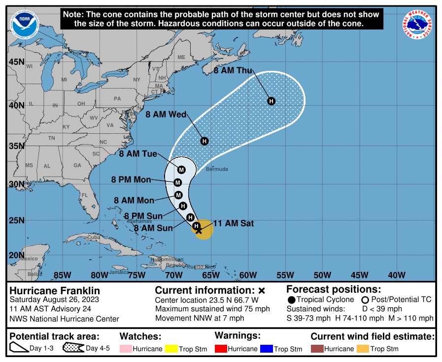 The NHC is forecasting Franklin to continue to strengthen into a category 3 storm, the season’s first major hurricane, by early next week.