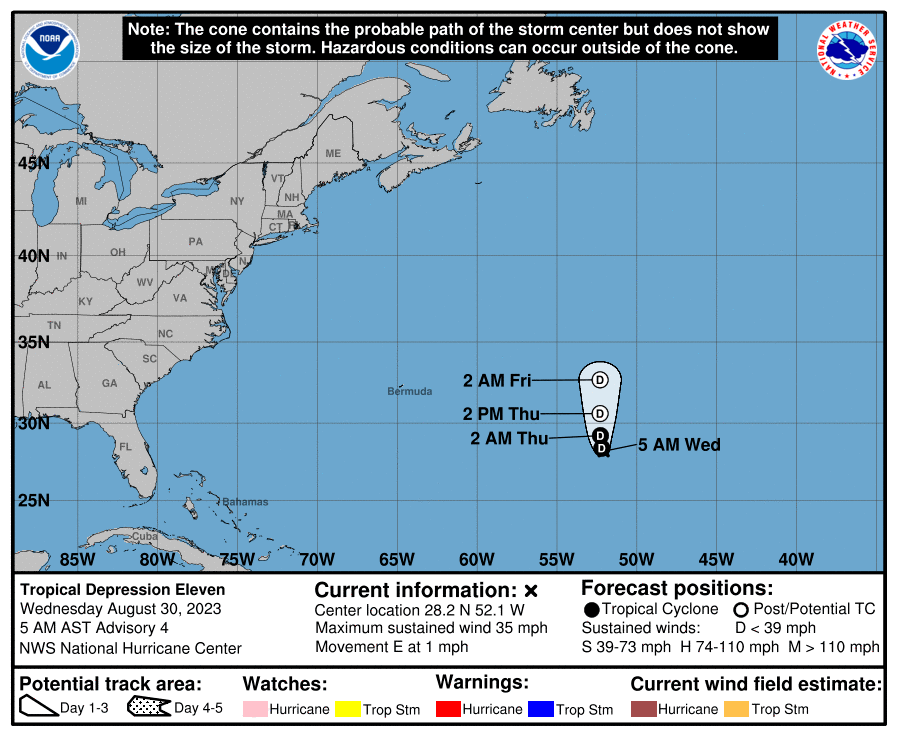 To the north-northwest of TD11, Hurricane Franklin is expected to bring tropical storm conditions to Bermuda later today.