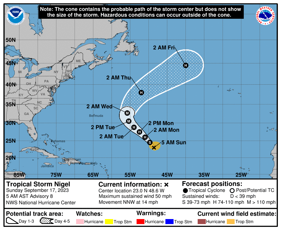 So far this season, there have been nine tropical storms and 3 hurricanes with two of them strengthening into major hurricanes, Idalia and Lee. Nigel could become the third major hurricane of the season.