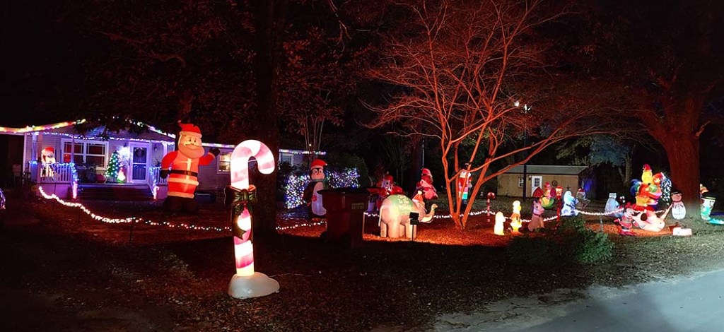 After cruising Mill Creek, turn south (left) on Hwy 4 and continue to the Mossy Oaks Plantation subdivision. Turn left on Dottie Street, then take an immediate left again. Lena Street has a long line of house decorations. At the end of the road, take the circle and enjoy the lights a second time. (Lena continues to the right, but only one or two houses on that long stretch of road are decorated.)