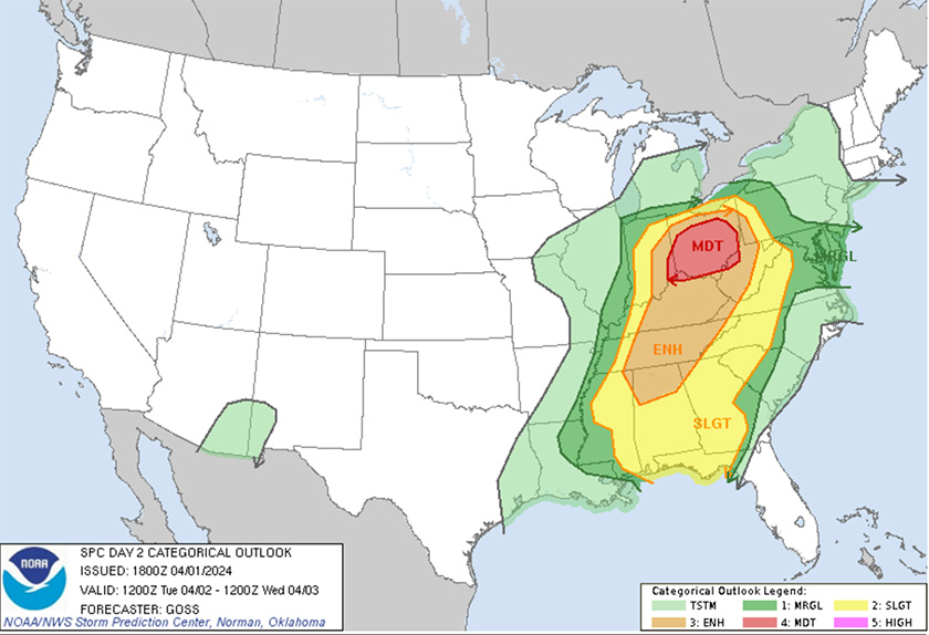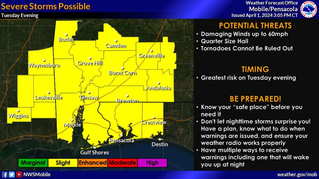HOLT, Fla., April 1, 2024—The overall risk for severe weather tomorrow evening has increased across the entire forecast area.