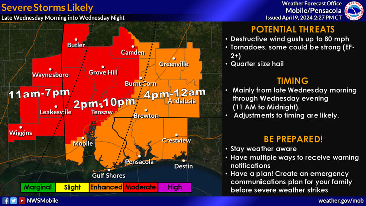 HOLT, Fla., April 9, 2024—Conditions are setting up for another severe weather threat across the region tomorrow afternoon into the evening.