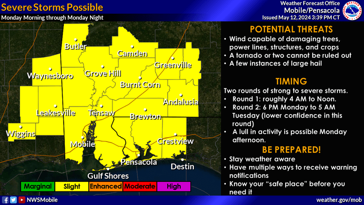 HOLT, Fla., May 12, 2024—There is a risk of severe weather tomorrow morning through early Tuesday morning.