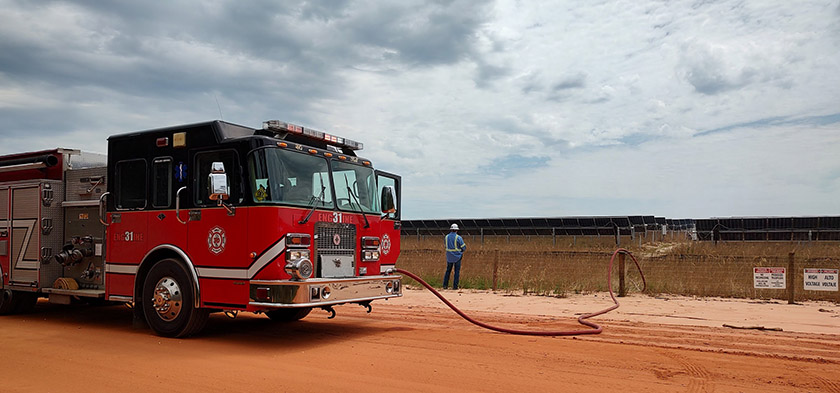 Although power to the section of the solar array threatened by the brushfire was turned off, the photovoltaic panels still collected and carried 1,500 watts of direct current electricity, making firefighter movement between the rows of the panels a bit hazardous.