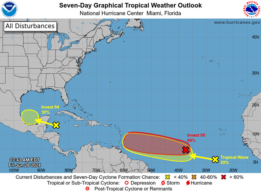 HOLT, Fla., June 28, 2024—The Atlantic is showing life as a third area of interest is added to the National Hurricane Center’s tropical weather outlook map today.