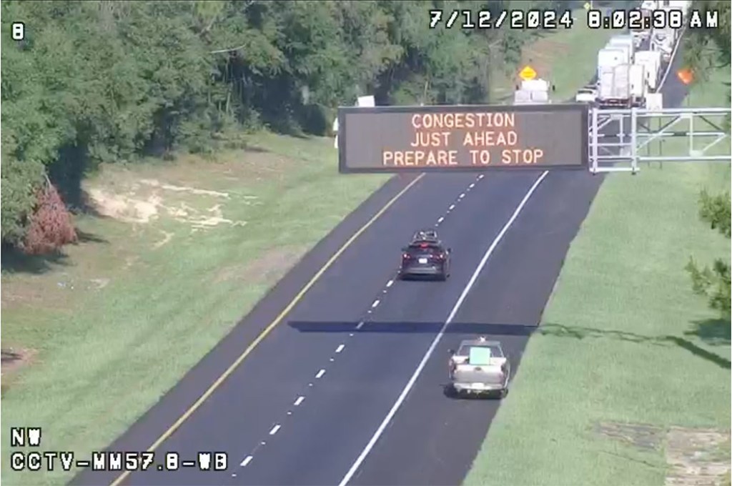 CRESTVIEW, Fla., July 12, 2024—The bridge over Wilkerson Bluff Road and westbound Interstate 10 were closed late last night when a dump truck struck the bridge with its bed still raised.