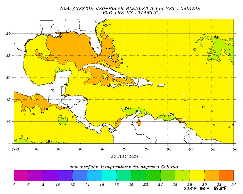 Conditions right now are highly favorable for tropical development. Sea surface temperatures in the Caribbean Sea and northeastern Gulf of Mexico are well above normal, in the mid-to-high 80s and higher near the coast.