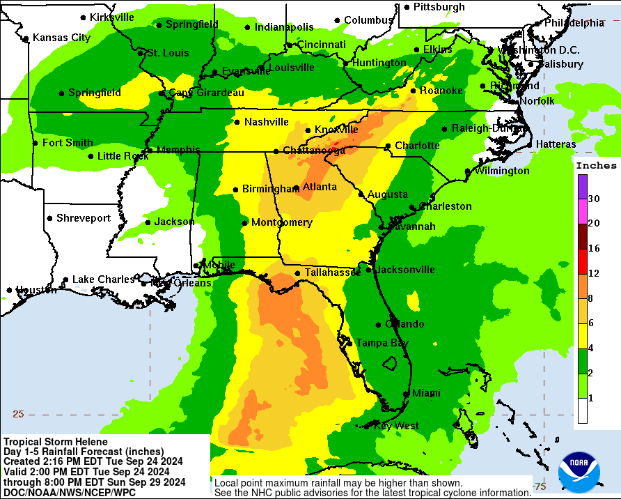 Okaloosa County could receive 2-4 inches of rain through Sunday from Helene. The forecast for tomorrow is 70-80 percent chance of showers and thunderstorms with 80 percent chance tomorrow night into Thursday.