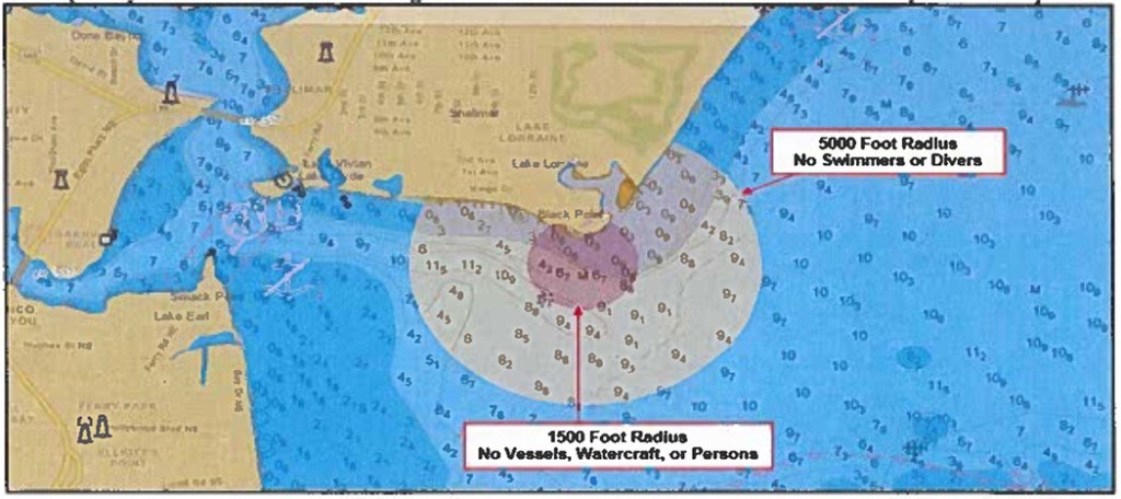 During this time, no person or vessel may enter, transit or remain in the area within a 1,500-foot radius of the explosion site, unless authorized. A no-swimmer or diver zone will also be enforced with a 5,000-foot radius of the site.