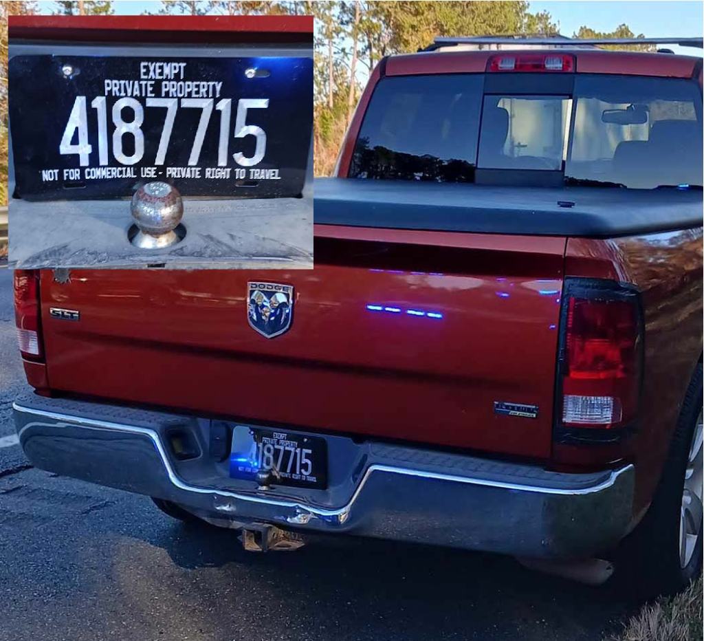 While patrolling the interstate, a Florida Highway Patrol trooper noticed a red pickup truck with what appeared to be an altered license plate which stated “EXEMPT PRIVATE PROPERTY 4187715 NOT FOR COMMERCIAL USE – PRIVATE RIGHT TO TRAVEL,” according to an FHP news release.