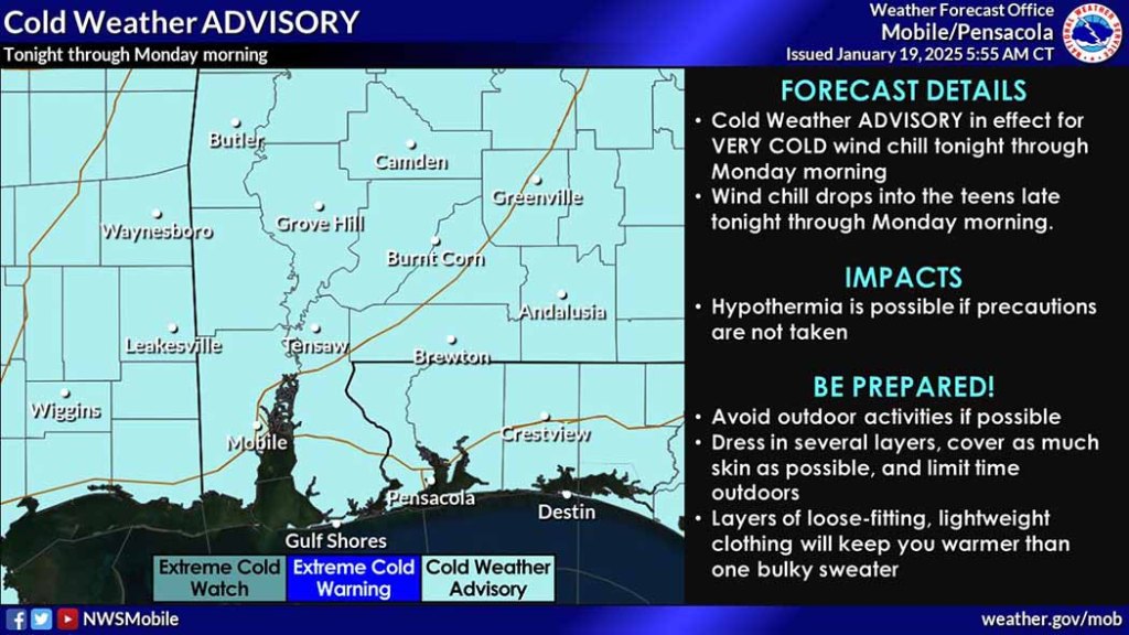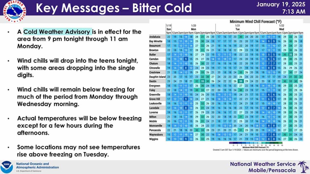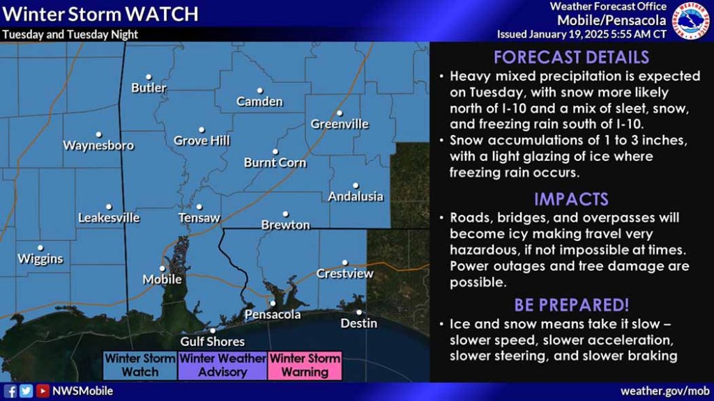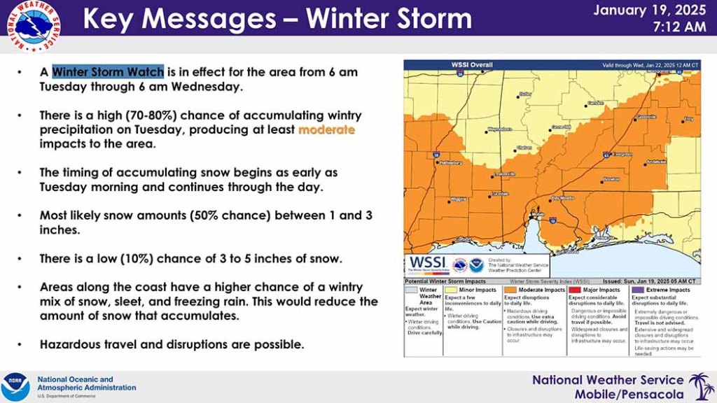 HOLT, Fla., Jan. 19, 2025— Winter storm impacts are expected Tuesday morning into the evening hours.