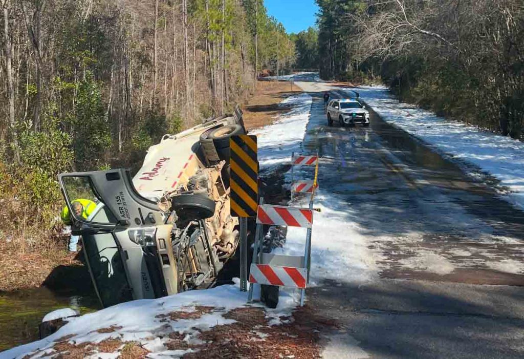 HOLT, Fla., Jan. 24, 2024—No one was injured when a garbage truck slid off a bridge on Bone Creek Road today.