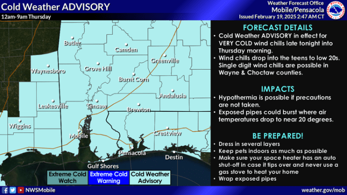 HOLT, Fla., Feb. 19, 2025— Expect bitterly cold temperatures tonight and tomorrow night as arctic air moves into the forecast area.