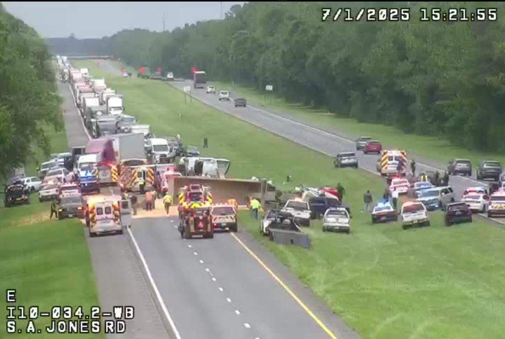 The accident occurred near mile marker 34 west of the S.A. Jones Road overpass sometime after 3 p.m. and closed both westbound lanes and one eastbound lane of traffic.
