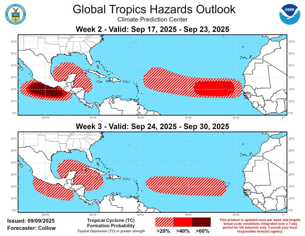 As for the rest of the season, the NHC has issued a two-week look ahead valid for Sept. 17 through the end of the month (or at least until it issues another global tropics hazard outlook). It shows the probability of some kind of tropical activity forming in the tropical Atlantic as well as the southern Gulf region.