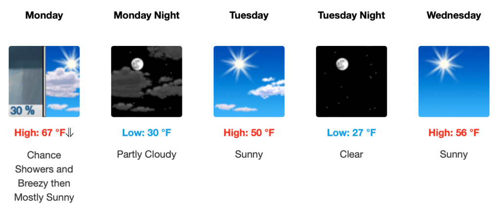 Monday’s high of 67 degrees will drop to overnight lows around 30 degrees. The forecast calls for 15-20 mph winds and up to 30 mph gusts that will result in wind chills between 20-25 degrees Monday night.